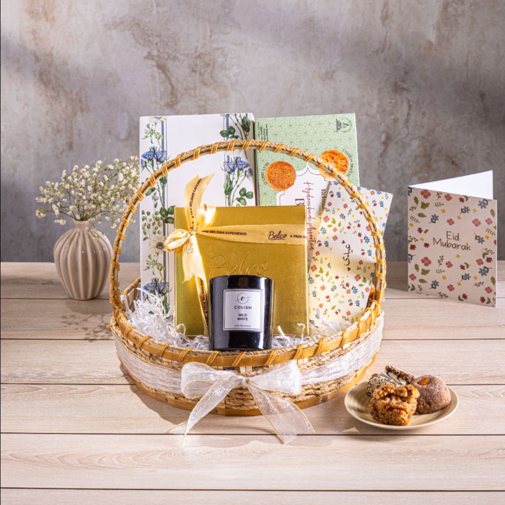 This hamper contains: Rehmat-e-Shireen biscuit box, S. Abdul Wahid mithai box, Belco chocolate bar, Colish candle, Eid greeting card, with envelope Basket (Large 12*12) + Packaging