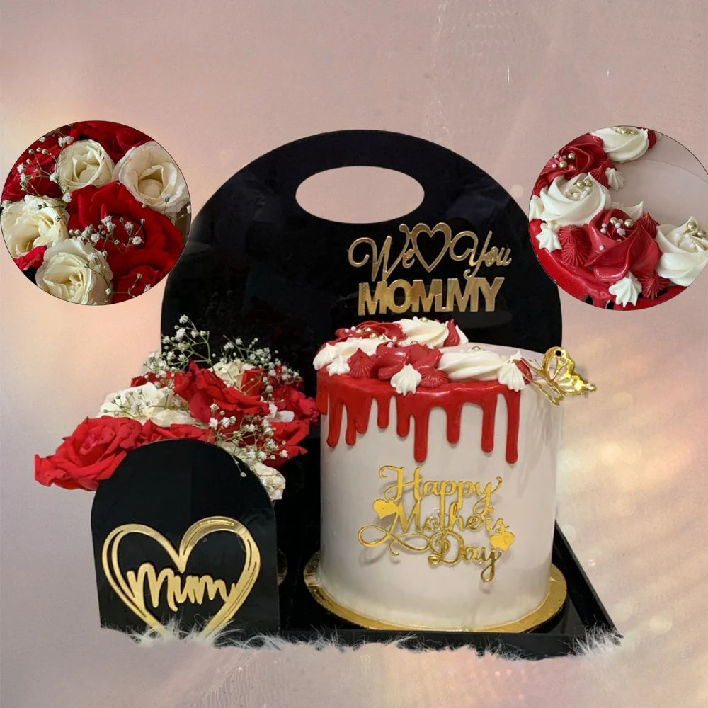 Show Mom how much she means to you with our Mother's Day Affection Platter. This thoughtful set includes a rich 2.5 lbs chocolate fudge cake, adorned with a beautiful Mother's Day theme, and a bouquet of fresh flowers elegantly arranged in a chic white acrylic basket. A perfect blend of sweetness and elegance to celebrate the woman who deserves it all.