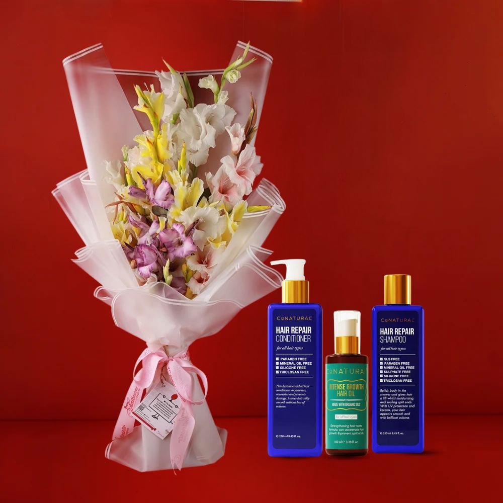 The Hair Growth Bundle with Aurore Gladiolus Bouquet is an elegant gift combination featuring a vibrant bouquet of multicolored gladiolus flowers paired with premium hair care essentials.