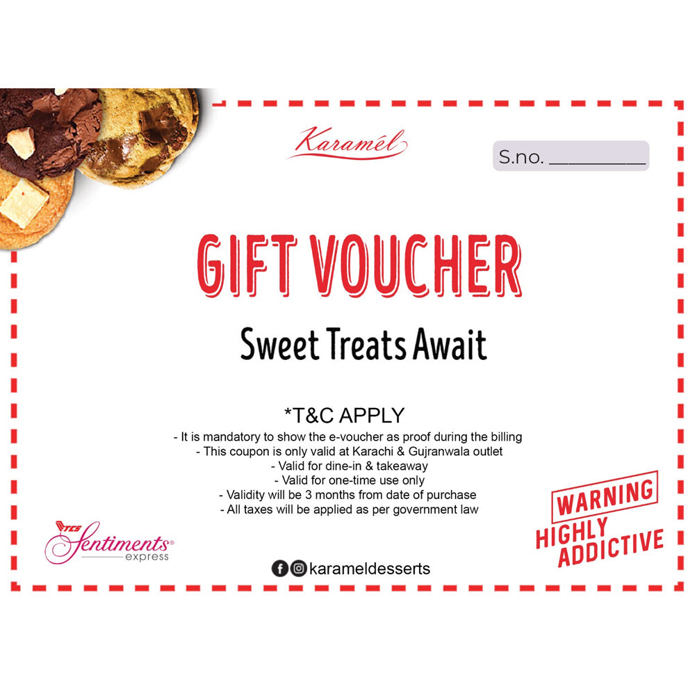 Indulge in delicious sweet treats with Karamel's exclusive gift voucher! In partnership with TCS Sentiments Express, this voucher offers a value of 2500 PKR & 5000 PKR, valid for use at Karamel's Karachi and Gujranwala outlets. Whether you're dining in or taking away, this voucher is perfect for a one-time treat. With a 3-month validity from the date of purchase, it's the ideal gift for any dessert lover. Get ready to satisfy your sweet cravings—hurry before time runs out!