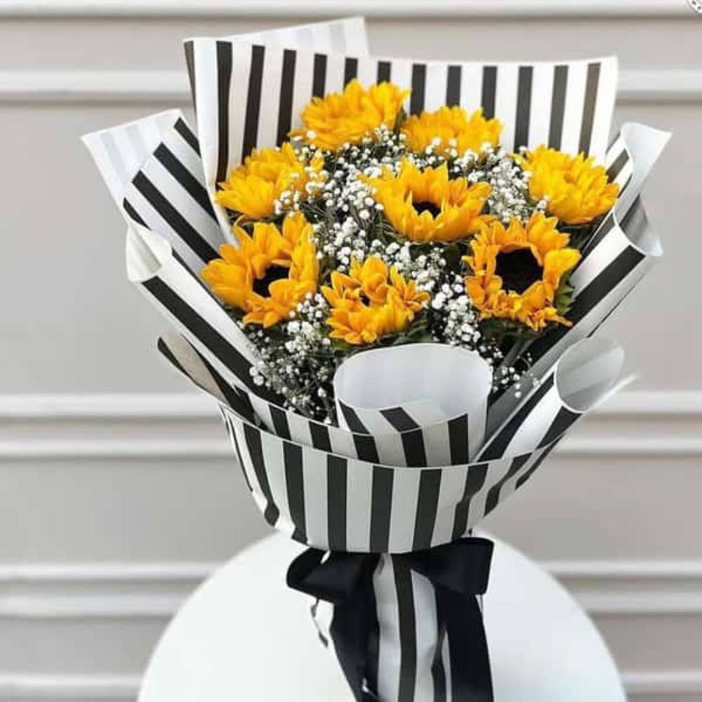 A dazzling arrangement of 8 vibrant sunflowers surrounded by delicate sprays of baby’s breath, symbolizing warmth, happiness, and everlasting love. Perfect for brightening someone’s day.