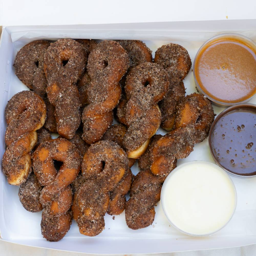 Soft cinnamon donuts crullers with three dips: Nutella, vanilla cream and caramel.