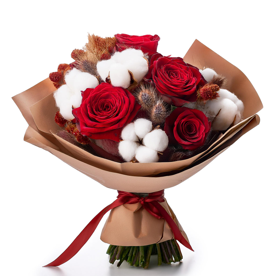 - Bouquet of 5 red roses, cotton flowers and dried flowers;