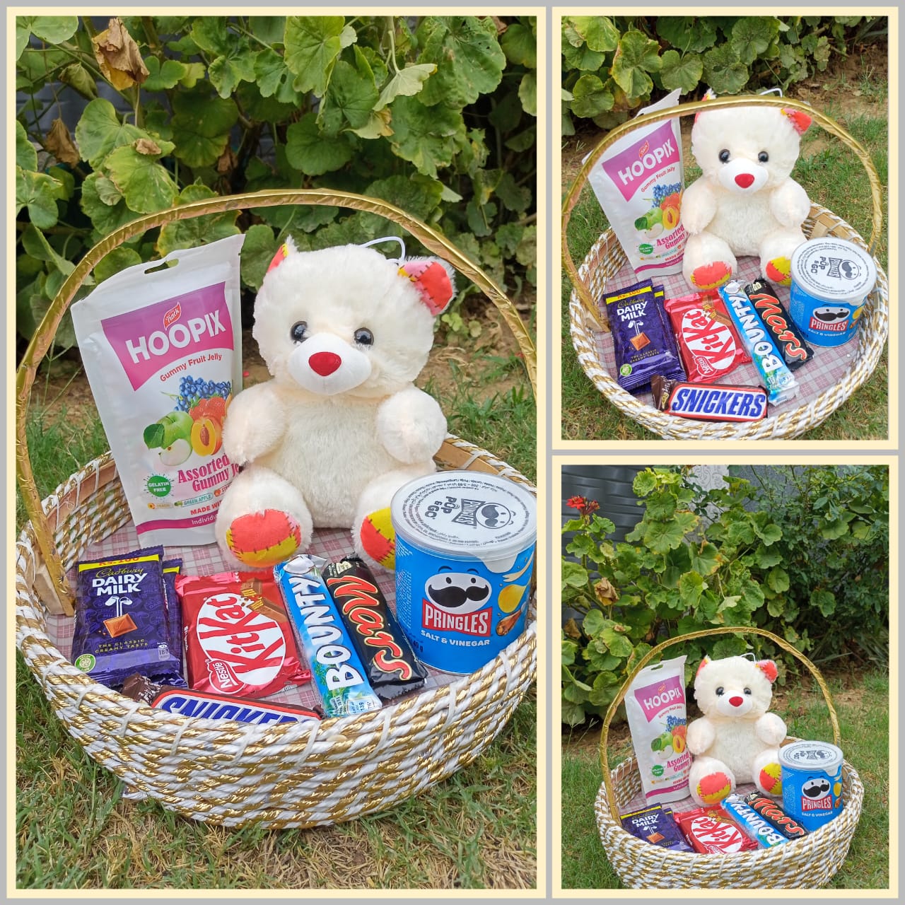 A sweet and cuddly gift basket filled with chocolate treats and a teddy bear.