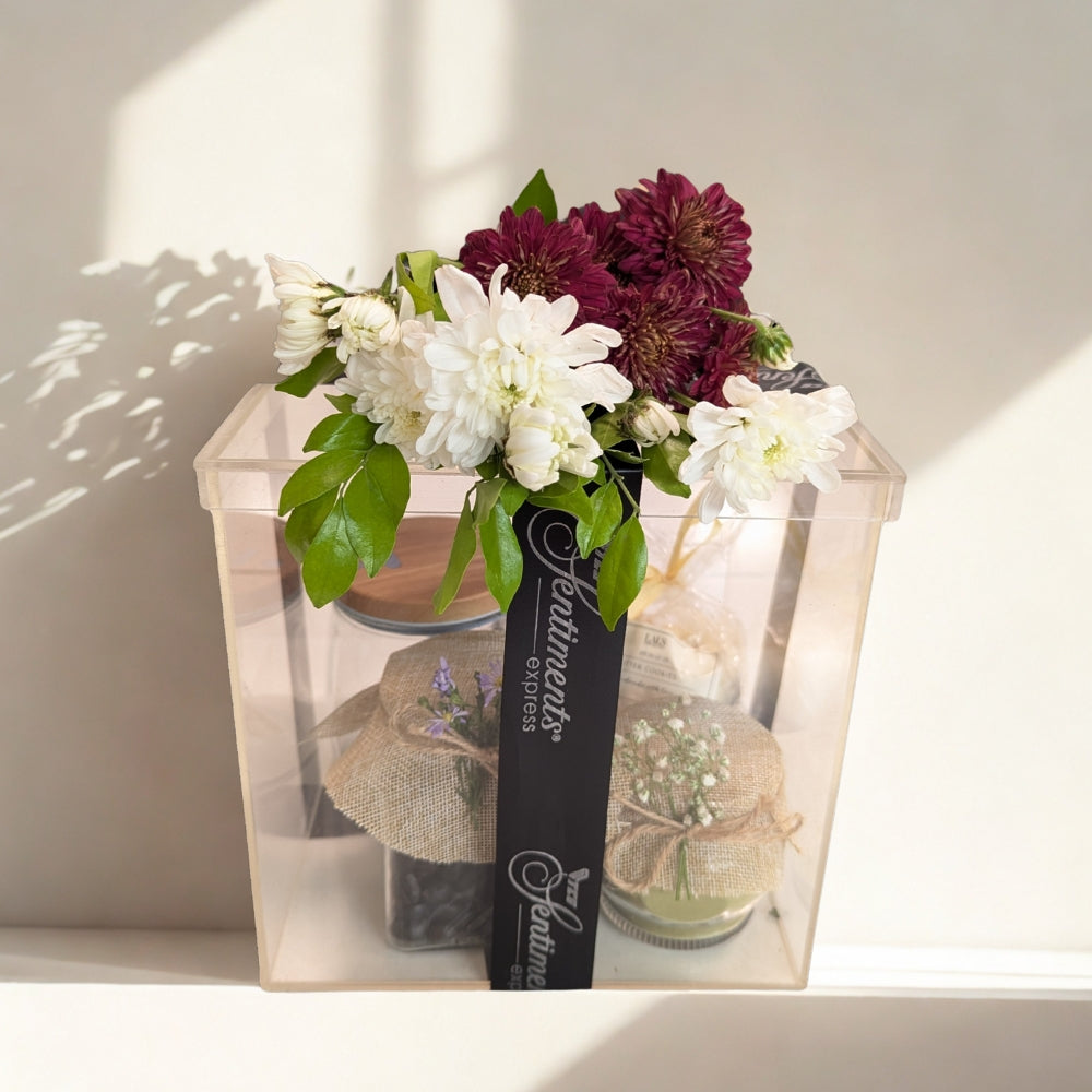 5. Two daisy stems (Maroon and White) delicately placed on top — a soft reminder to pause, bloom, and breathe