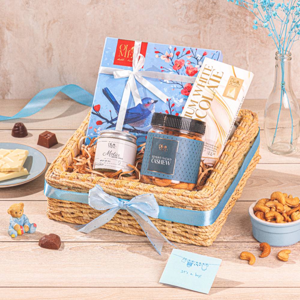 A cute square basket to welcome your little one in style. Includes a Blue Bird Box of 16, white chocolate bar, roasted cashew, and a cozy coffee-scented candle. Wrapped in blue with a matching bow and an “It’s a Boy” card — sweet, simple, and full of joy. A basket you’ll want to keep — or pass along with love.