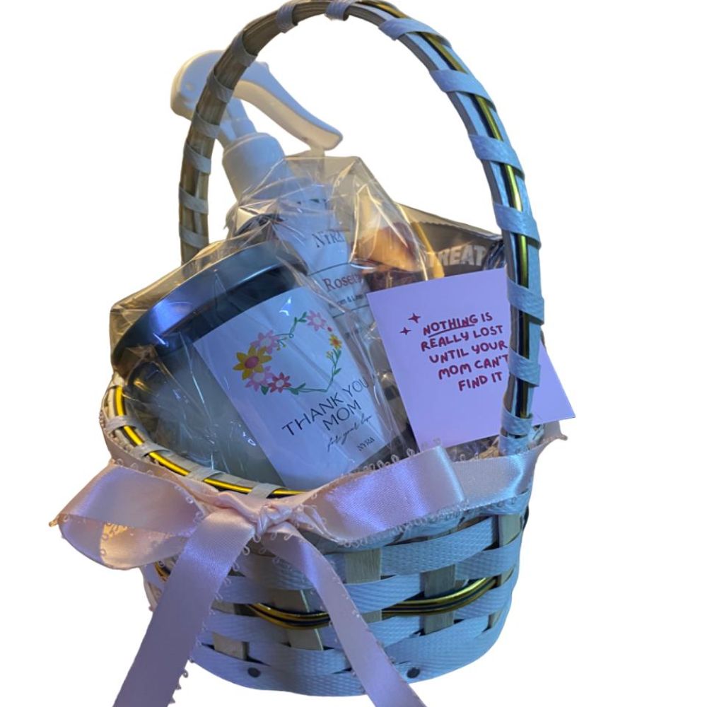 Beautifully decorated basket comprising candle, Room and Linen mist, Card and assorted chocolates.
