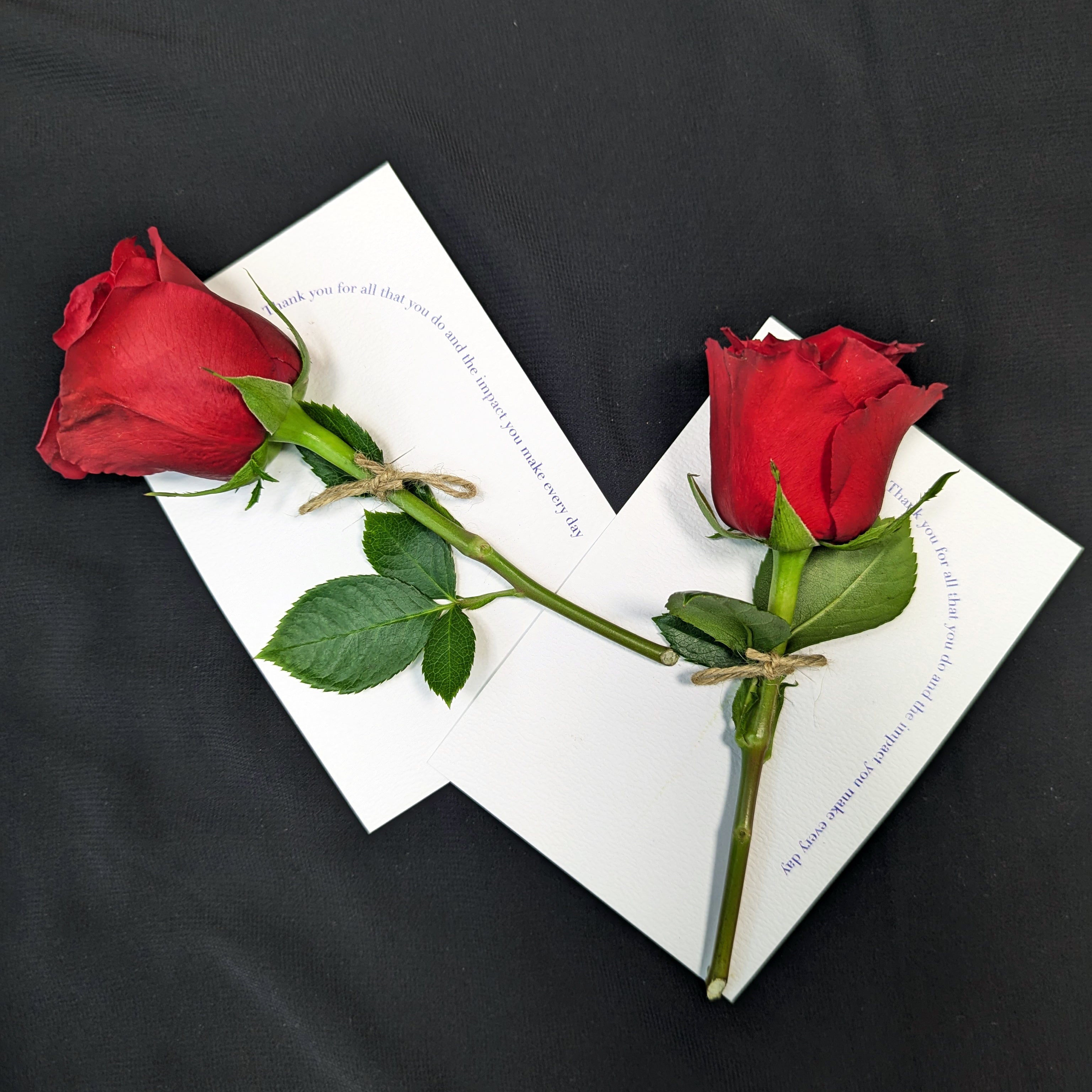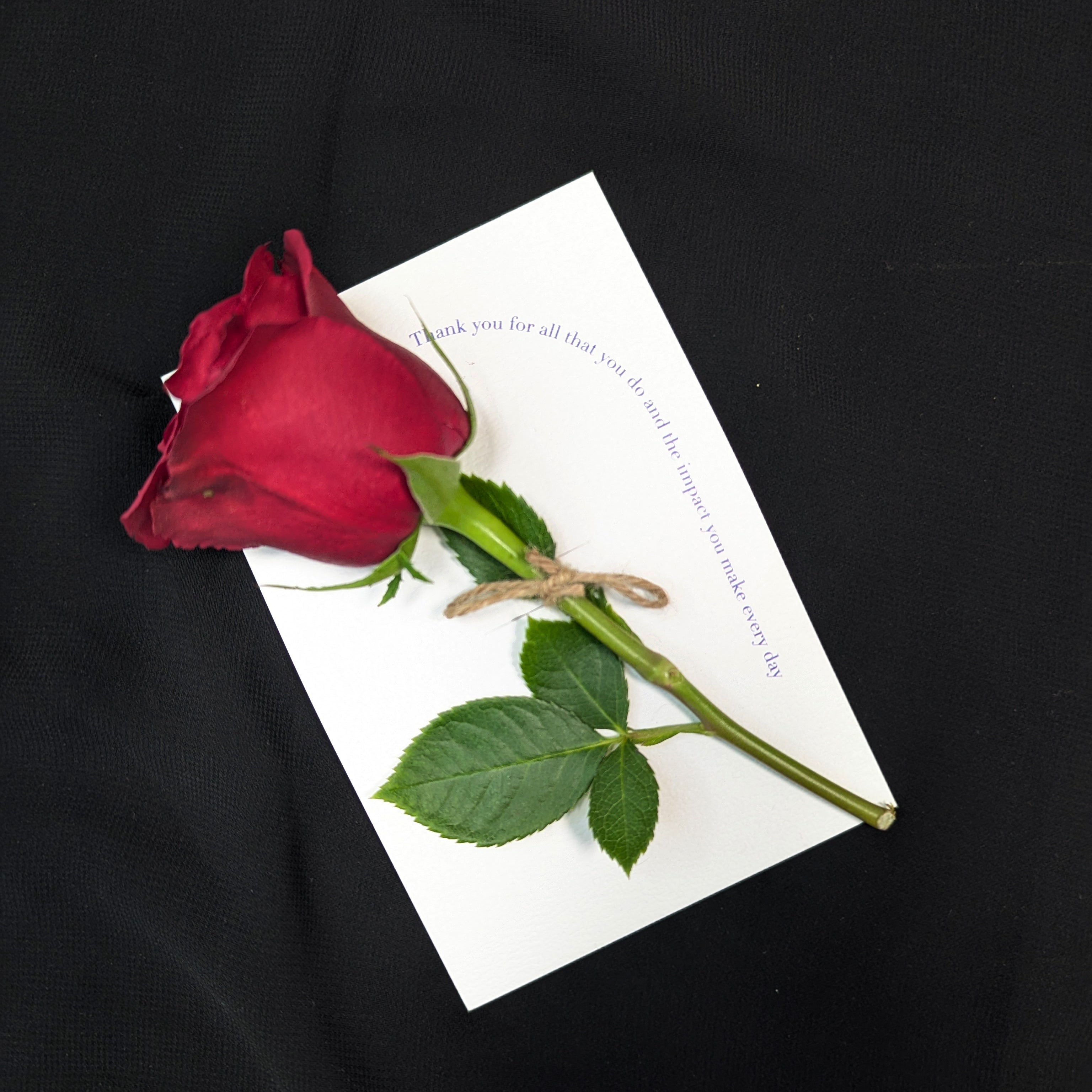 A single imported rose card is an expression of appreciation and admiration. The card "Thank you for all that you do and the impact you make every day" honors the kindness, love, and light they bring every day, reminding them just how cherished they are.