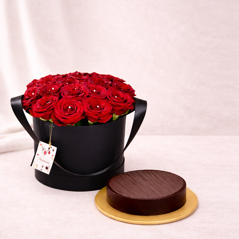 Deep red roses and a rich chocolate cake come together in a gift that speaks of warmth, care, and quiet indulgence.