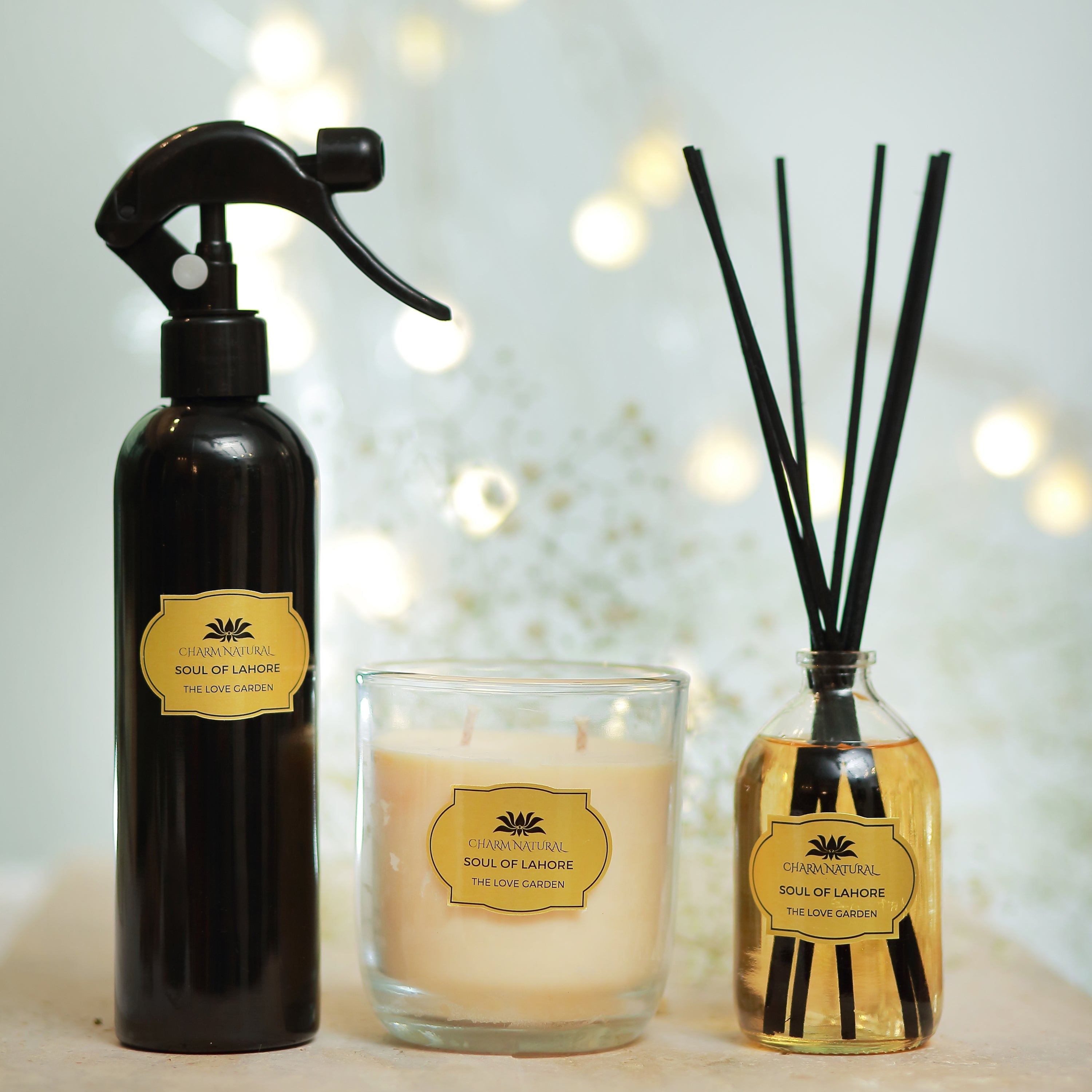 Transform your space with the Trio (The Love Garden) Bundle. This set features a scented candle, reed diffuser, and room & linen mist, all infused with romantic floral notes. Presented in a stylish round basket, it's ideal for creating a serene and inviting ambiance.