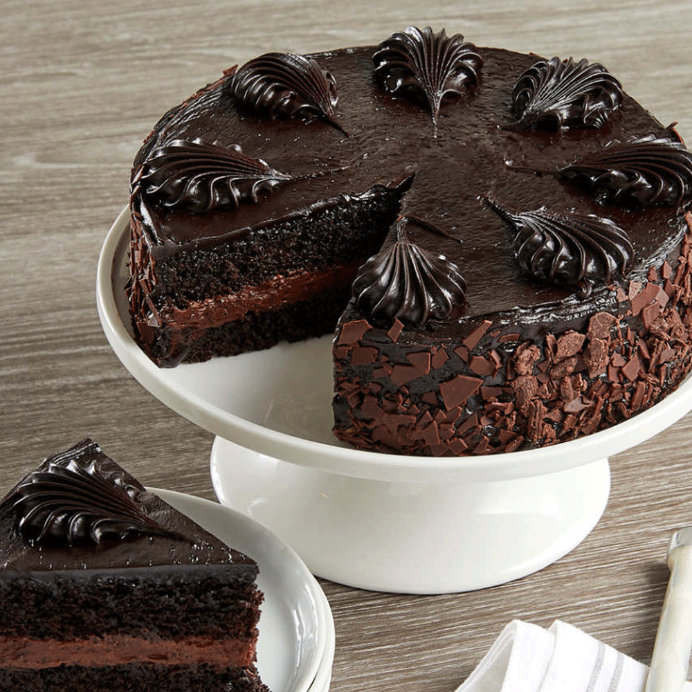 Two rich, chocolate cake layers are filled with luscious chocolate whipped cream mousse, then covered with milk chocolate frosting and a dark chocolate glaze. This best selling delight is then garnished with fudge rosettes and dark chocolate shavings.