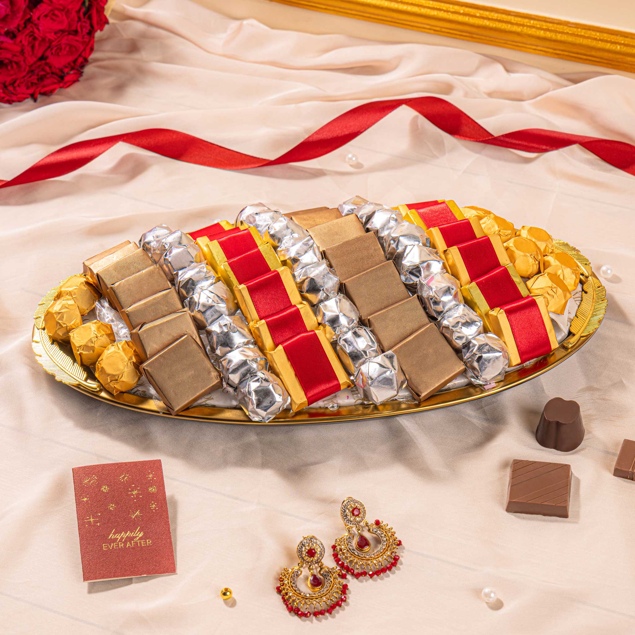 A grand celebration in gold, this extra-large rectangular platter holds indulgent chocolate bon bons, elegantly wrapped in a teal ribbon that adds a touch of festivity.