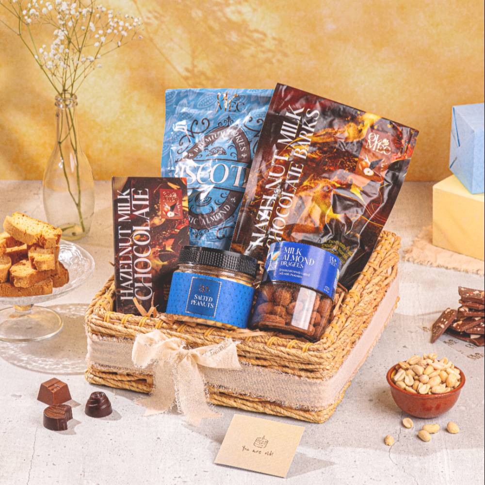 A cute grass basket packed with birthday treats — includes amond biscotti, peanuts, Hazelnut Milk Chocolate Bar and Bark, Dragees and a cozy candle. Wrapped with a Happy Birthday ribbon for all the celebratory feels. A timeless basket — yours to use or share again.