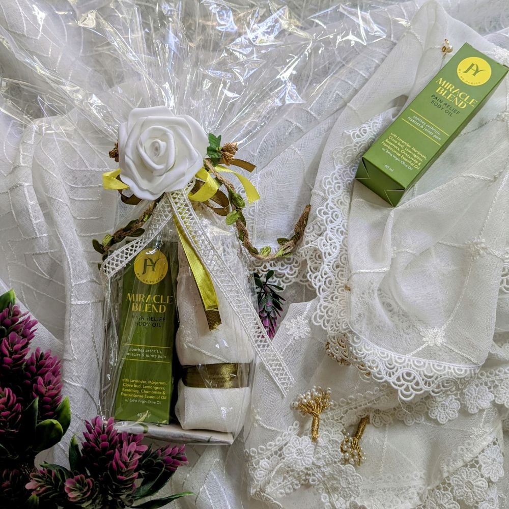Experience ultimate relaxation with our Serenity Bundle consisting of MIRACLE BLEND Pain Relief Oil, expertly crafted to soothe sore muscles and joints. Paired with a beautiful Lace-edged and delicately embellished tray cover, elevate your self-care routine with a touch of elegance.