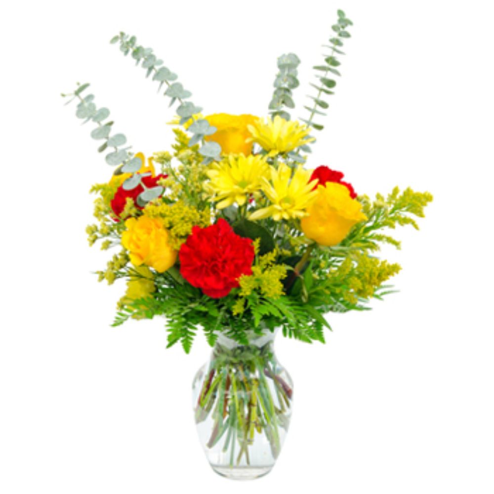 - Bouquet of yellow roses, red carnations and yellow spray chrysanthemums with greenery;