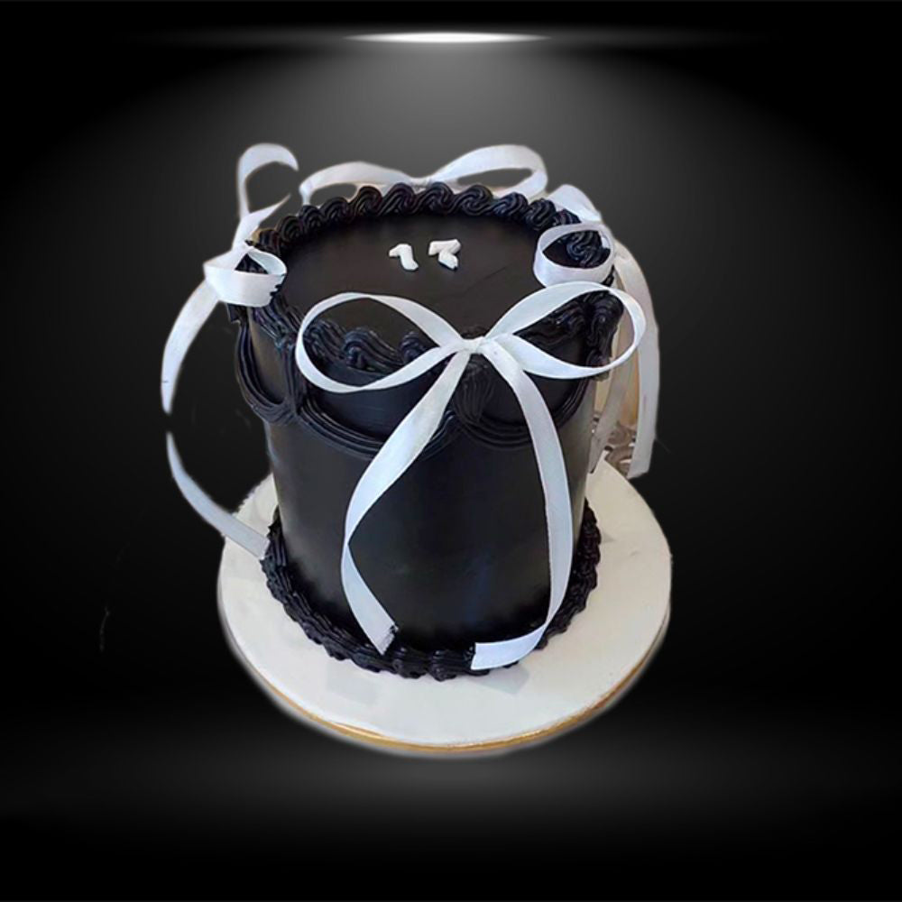 Introducing our exquisite Black Theme Vintage Ribbon Cake in a rich and indulgent chocolate flavor. This elegant cake is adorned with a vintage ribbon design, adding a touch of sophistication to any occasion. The luscious chocolate flavor will delight your senses and satisfy your sweet cravings. Whether you're celebrating a special milestone or simply craving a decadent treat, this cake is the perfect choice.