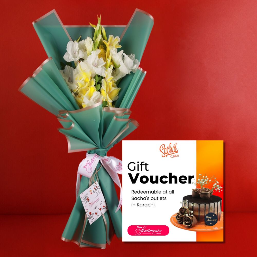 Brighten someone's day with Sacha's Gift Voucher accompanied by our Vibrant Bouquet of Yellow Gladiolus. This striking arrangement of sunny gladiolus flowers radiates warmth and joy, making it a perfect gift for any celebration. Share the cheer and offer the freedom of choice with this delightful combination.
