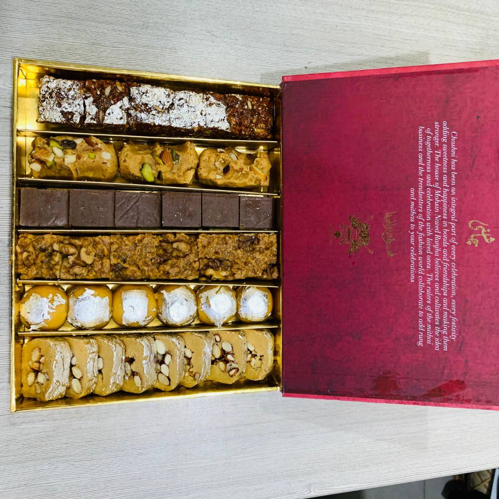 A regal assortment of rich, handcrafted mithai—each piece steeped in tradition and indulgence. From the luxurious Akhrot Halwa to the fragrant Zafrani Pera, this box is a celebration of heritage sweets with a refined twist. Ideal for marking special moments or honouring someone with a taste for timeless elegance.