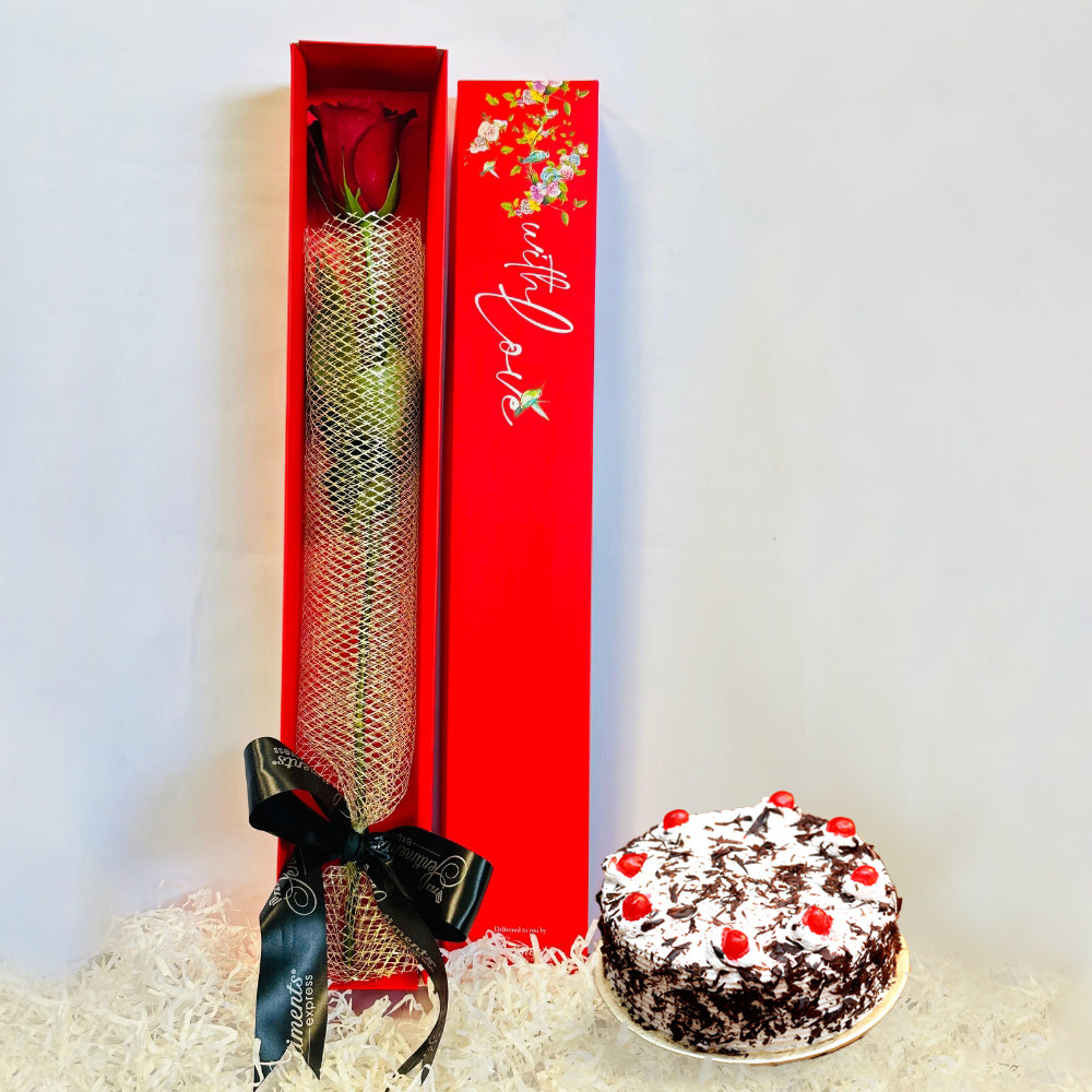 Black Forest Cake 2 lbs + Single Imported Long Stem Rose in With Love Box