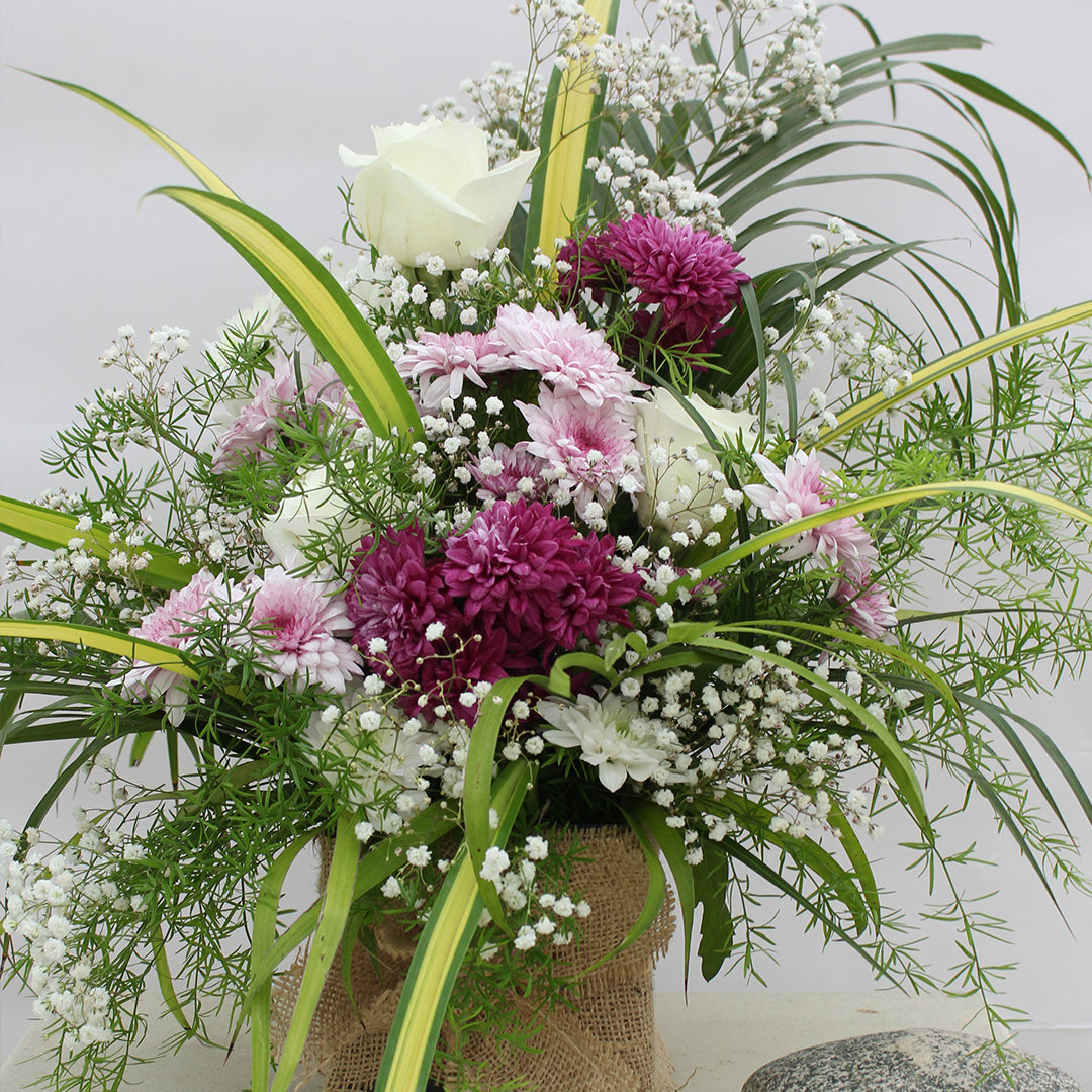 All your loved one's wishes would come true once they receive this bright, mesmerizing bunch of flowers. White roses and chrysanthemums are beautifully arranged and wrapped with jute.