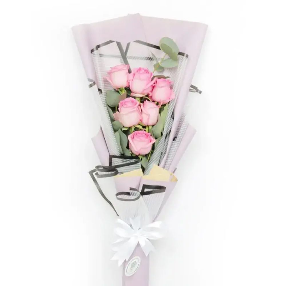 Surprise arrangement of 6 pink roses in a bouquet for loved one