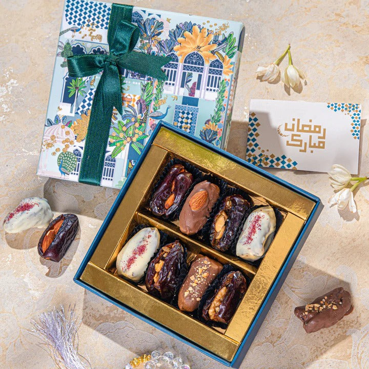 The Shalimar Teal Box is not just any ordinary box - it's a statement piece that's sure to turn heads. Inspired by the intricate patterns and designs of our Shalimar collection, this box features an eye-catching and elegant design filled with fresh and juicy Kalmi Dates that make it a perfect addition to Ramzan Gifting. Our chocolate dates are dipped in milk, white or dark chocolate, and topped with roasted nuts or candied orange. Our nut-filled dates are handmade with freshly roasted and caramelized nuts. These Saudi dates are loaded with nutrients.