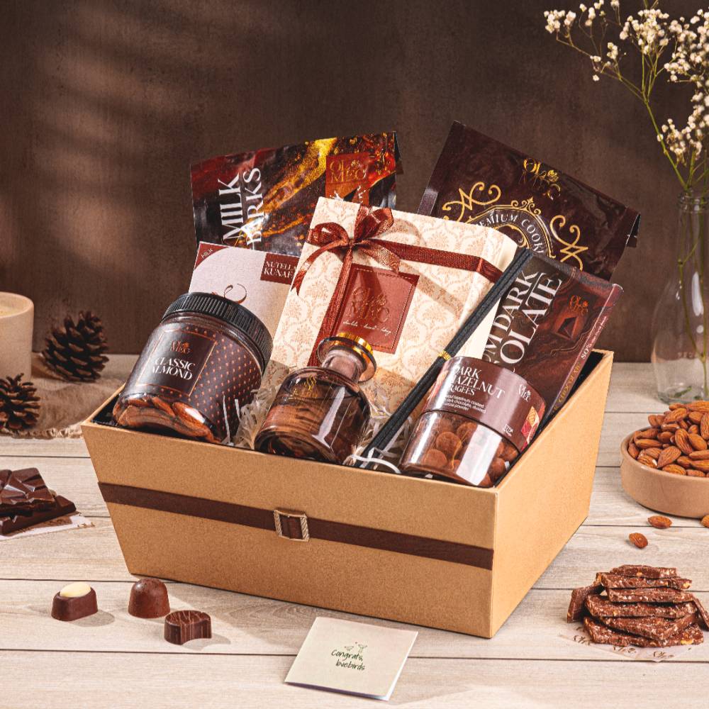 A grand curation for life’s biggest moments. This hamper brings together our Heritage Box of 9 bon bons, Hazelnut Milk Chocolate Bark, Double Chocolate Biscotti, and a Premium Dark Chocolate Bar — paired with Nutella Kunafa, Classic Almonds, and Dark Hazelnut Dragees. Finished with a Jugnu Reed Diffuser and a greeting card, it’s a complete sensory experience made for memorable celebrations. Gift it forward or keep it for yourself — a basket worth holding onto.