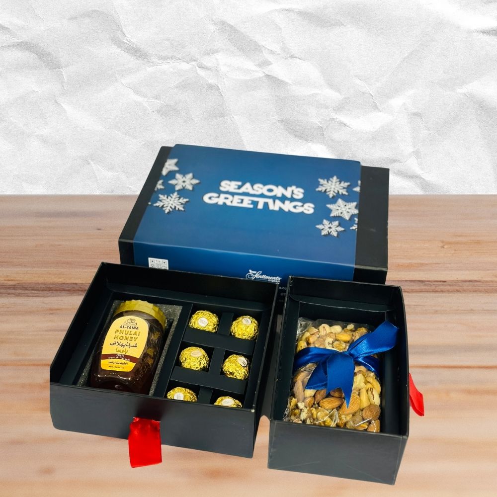 250ml Flavored Honey + 6 Ferrero Chocolate + 250gm Dry fruit in Tray Hard Box.