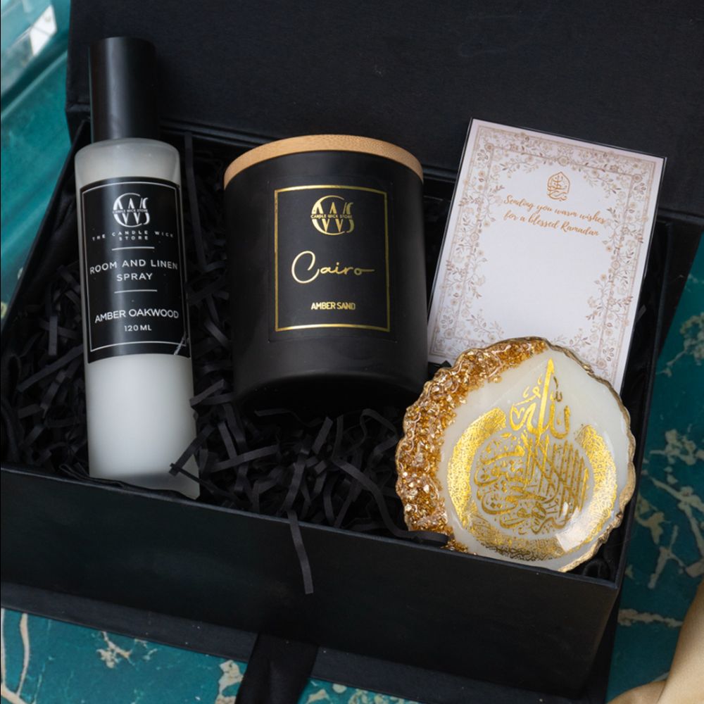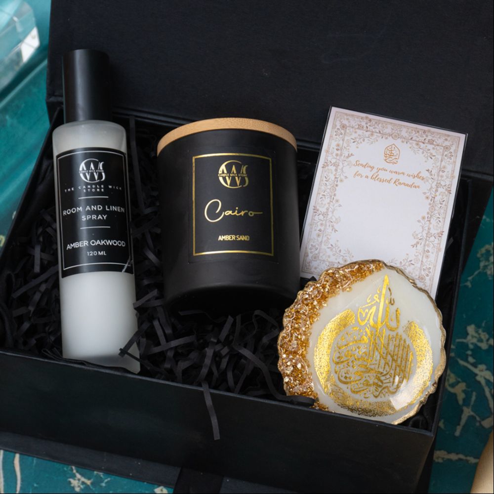 Embrace the essence of Ramadan with this thoughtfully curated gift box, designed to infuse your home with serenity and warmth. This set includes our Oudh Diffuser, to fill your home with a rich, long-lasting fragrance that lingers beautifully. The Regular Pillar Candle adds a warm, comforting glow, perfect for quiet moments of reflection or setting a peaceful atmosphere during suhoor and iftar. The Coaster is a sophisticated addition to your table, while the Ramadan Card serves as a heartfelt reminder of the season’s blessings. Beautifully packaged in our signature black gift box, this set is an ideal way to embrace the Ramadan spirit or share its warmth with loved ones.