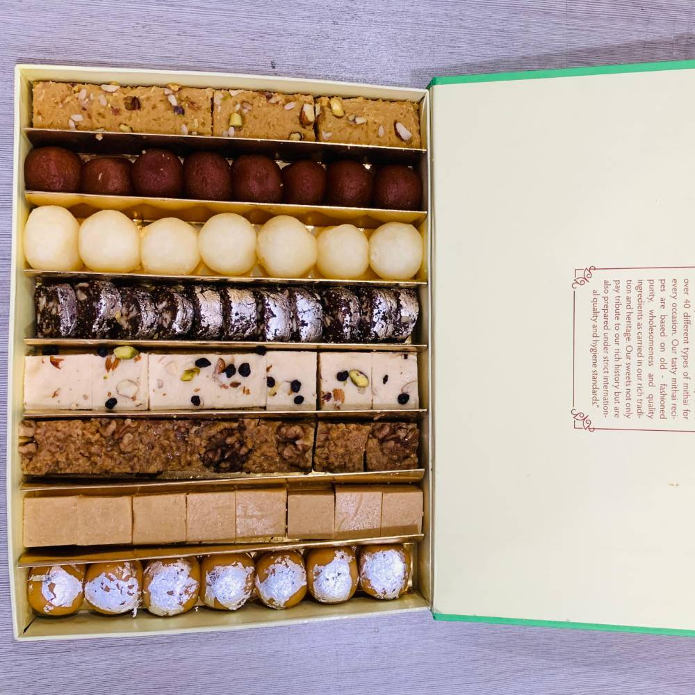 A generous and vibrant assortment of traditional sweets, thoughtfully curated to celebrate every cherished moment. From syrup-soaked classics to nut-rich delicacies and milky favourites, this box brings together a spectrum of beloved flavours in a bold, festive presentation.