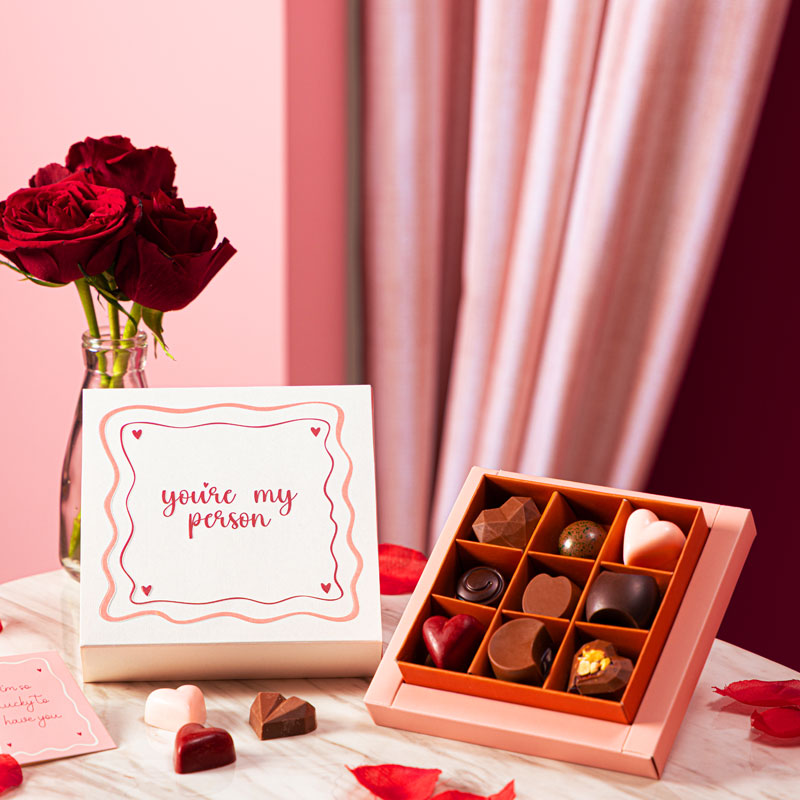 A keepsake box for your forever person, 9 handcrafted bonbons wrapped in a You’re My Person box sleeve.