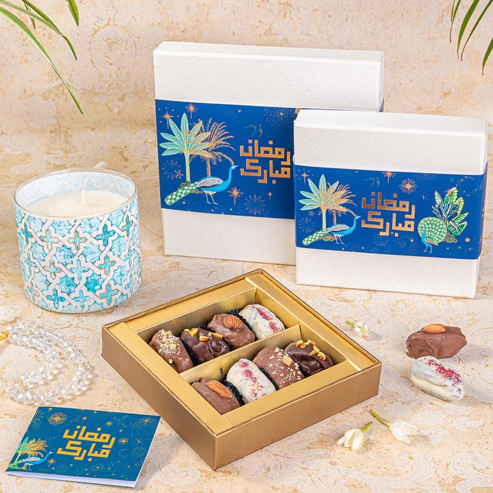 Celebrate Ramazan with your favorite people with delicious Chocolate coated & Nut filled dates from Lals in our keepsake white leather box with a gorgeous band inspired by the stunning art and architecture of the Mughal era. This teal-colored band features a beautifully detailed peacock design and has a gold foil Ramzan mubarak caligraphy on it. Our chocolate dates are dipped in white or dark chocolate milk and topped with roasted nuts or candied orange. Our nut-filled dates are handmade with freshly roasted and caramelized nuts. This box has the following date options:-