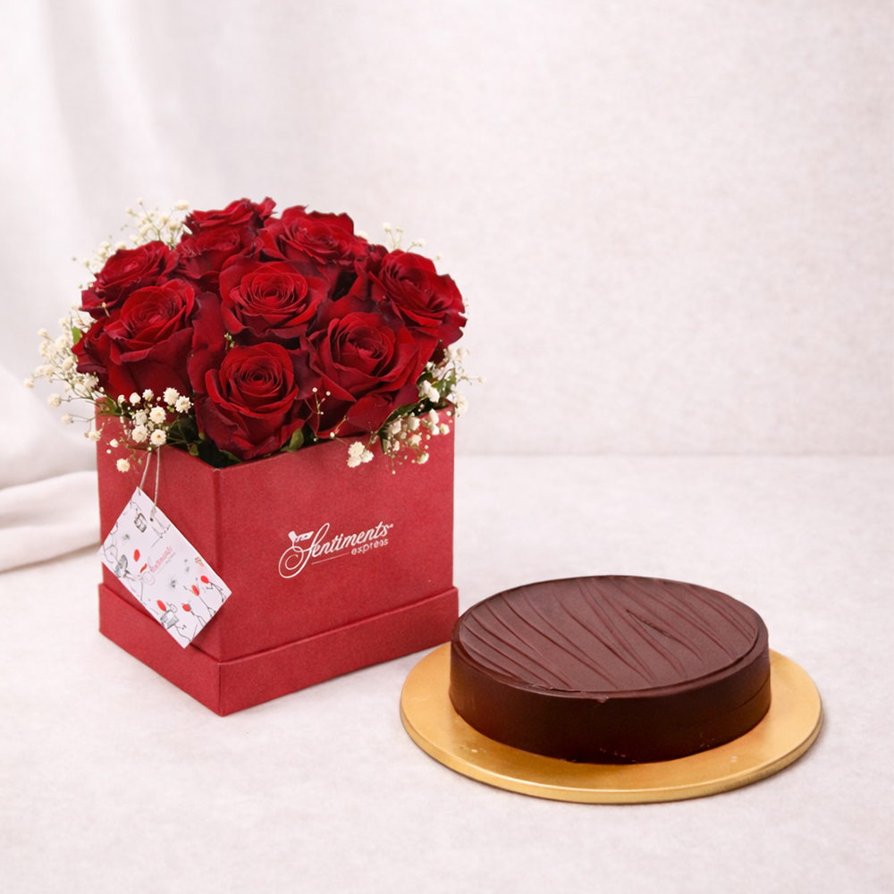 Deep red roses paired with a decadent chocolate cake, made to express feelings that words often can’t.