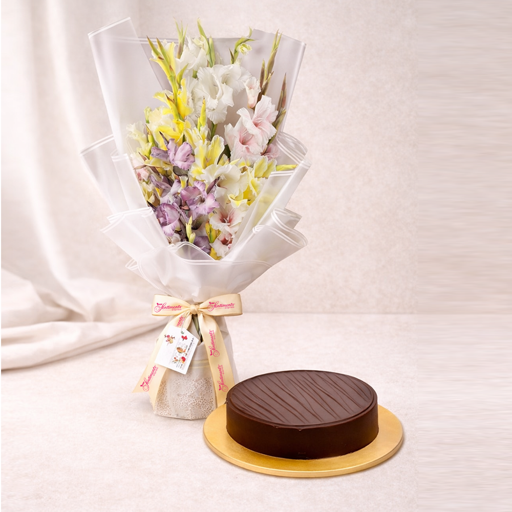 Bright florals paired with a beautifully crafted chocolate cake, made to lift moods and leave behind gentle smiles.