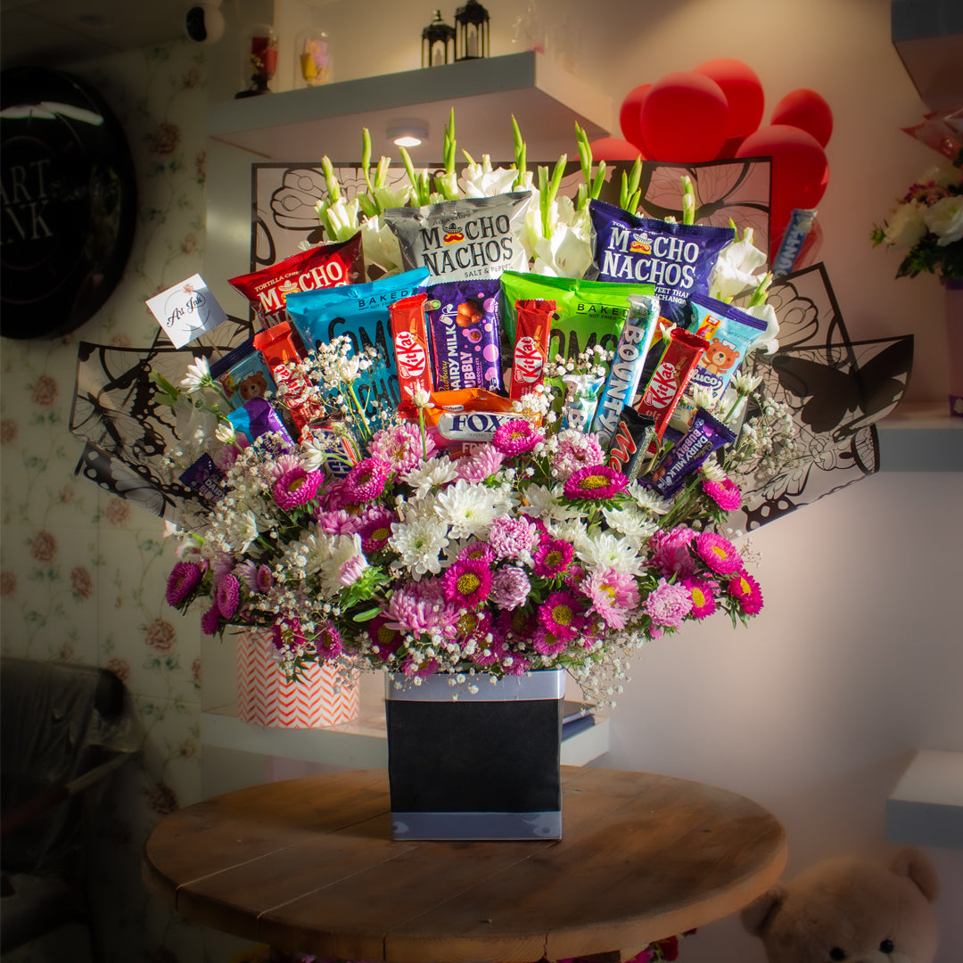 A stunning floral arrangement packed with everyone's favorite snacks. This impressive gift features a vibrant mix of fresh flowers, including 4 chrysanthemums, 4 gerberas, 2 asters, and 8 gladiolus, combined with an incredible selection of treats. 3x Macho Nachos, 2x Nom's Nachos, 4x 2 finger kitkats, 3x Dairy Milk Bubbly, 2x Bounty, 1x Dairy Milk Oreo, 1x Snickers, 1x Mars, 1x FOXS, 2x Glucose.