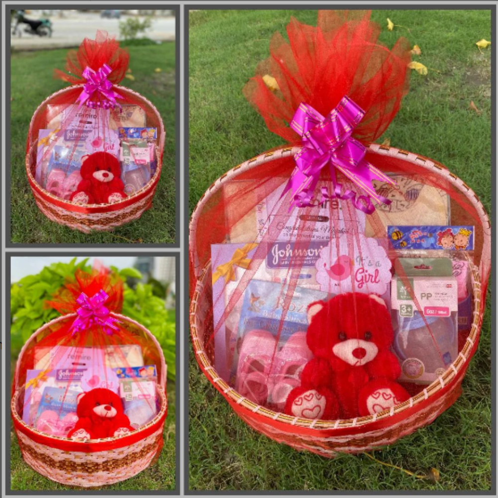 A thoughtful baby gift basket filled with essentials for a new arrival.
