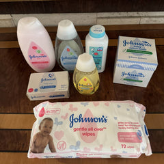 This is a beautifully arranged gift basket featuring Johnson's baby products. The basket, adorned with soft packaging material for cushioning, is ideal as a baby care gift set, providing a thoughtful selection of essentials for newborn care. The background features elegant ceramic decor, enhancing the presentation's charm.