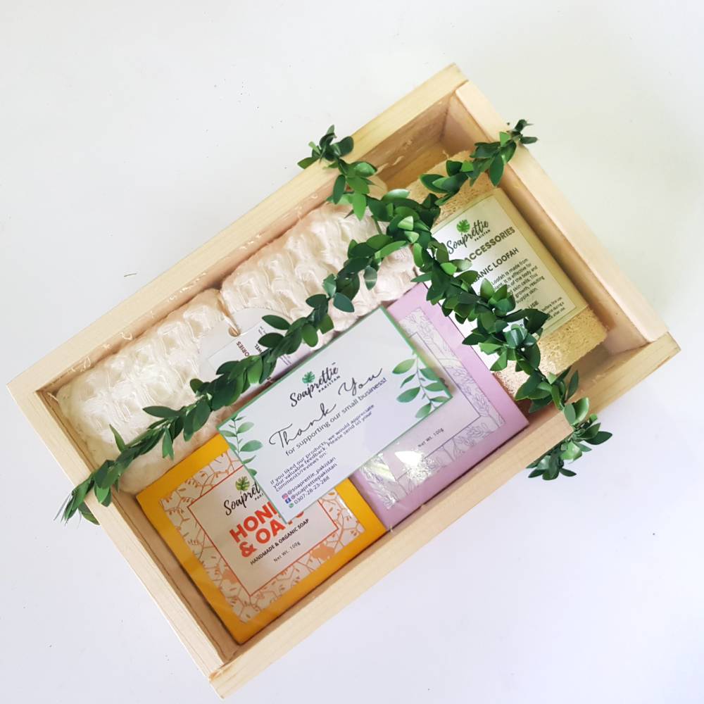 Blossom Bath Collection is a wooden gift box with acrylic lid that includes two handmade soaps, an organic Loofah and waffle hand towel. It comes in a Wooden Gift Box with acrylic sliding top