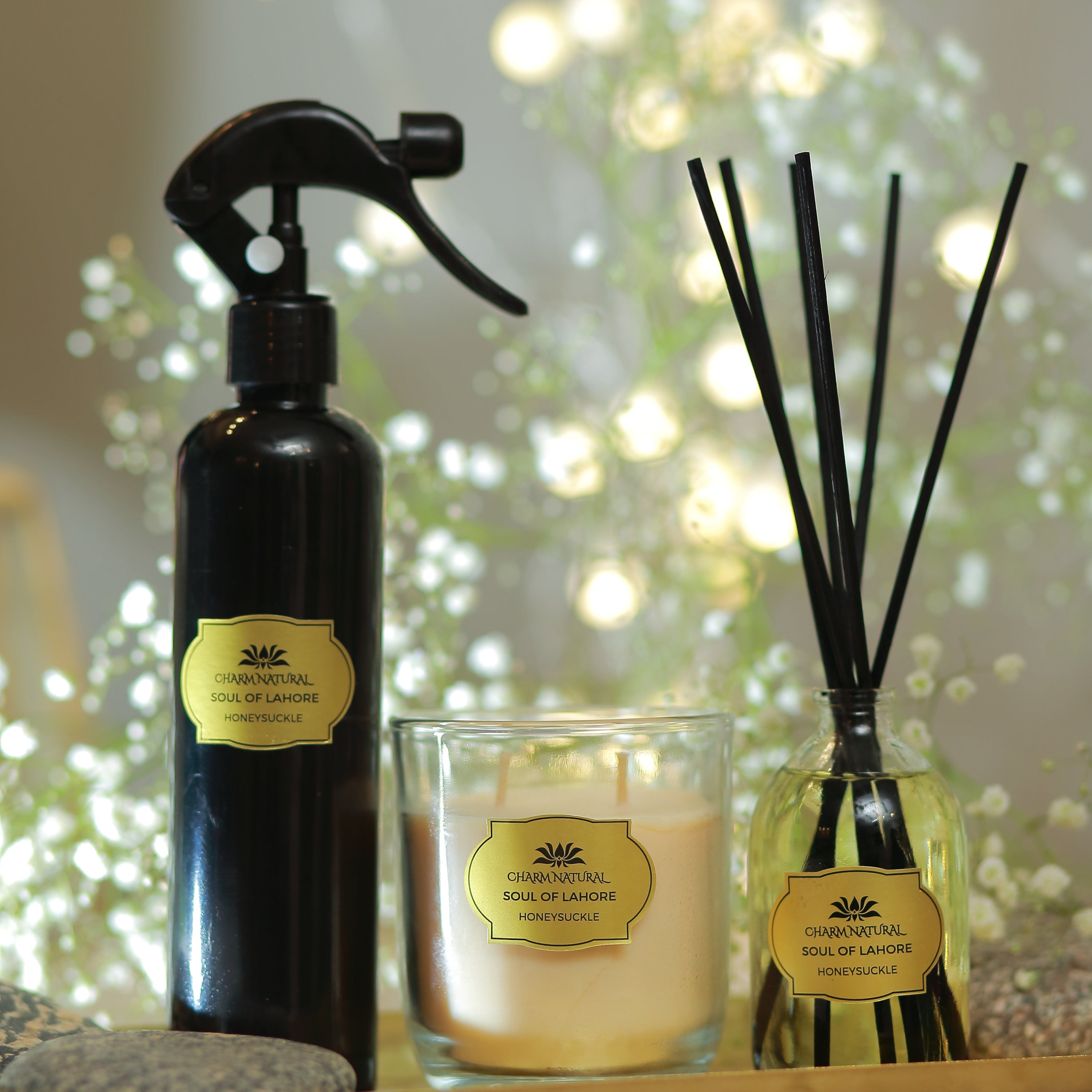 Embrace the sweet, floral essence of honeysuckle with our Trio (Honeysuckle) Bundle. This elegant set features a scented candle, reed diffuser, and room & linen mist, all delivering a captivating honeysuckle fragrance. Presented in a chic round basket, it’s ideal for enhancing any space with a touch of luxury and charm.