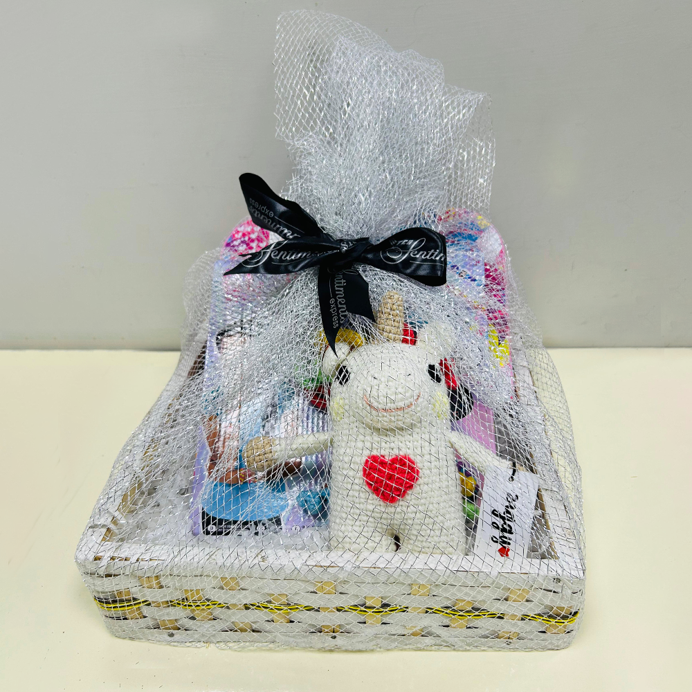A beautifully curated basket for girls with a Bracelet Set, Weaving Kit, and Polly and Other Stories Toy. Ideal for igniting imagination and style.