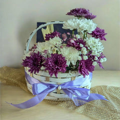 • A white basket half filled with fresh chrysanthemums in soft purple and white hues (7 stems)