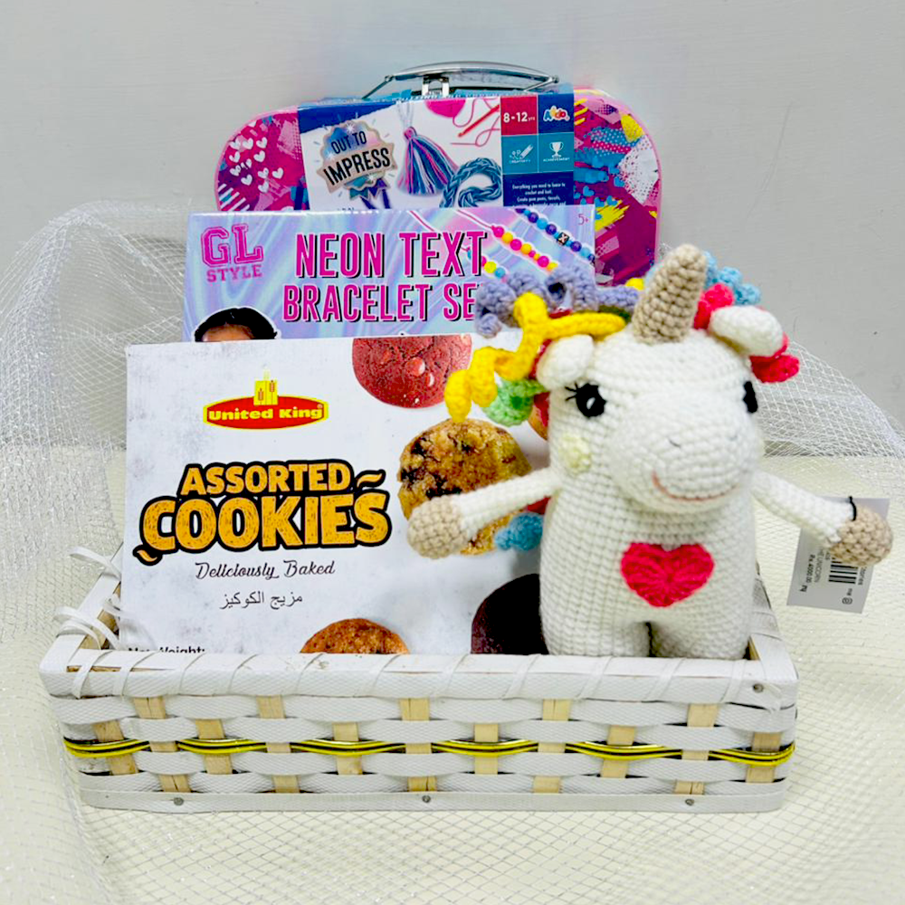 A charming gift basket for girls featuring a Bracelet Set, Weaving Kit, Polly and Other Stories Toy, and Assorted Cookies by United King. A combination of creativity and treats for young adventurers.