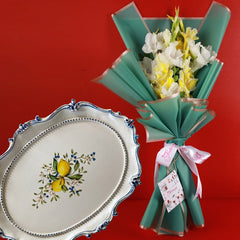 The Golden Whisper Bundle is a sophisticated pairing of elegance and charm. It features a vibrant bouquet of golden yellow and white gladiolus flowers, beautifully wrapped to radiate warmth and grace. Accompanying the bouquet is a vintage-inspired decorative tray adorned with a delicate hand-painted lemon and floral design, adding a touch of timeless beauty. This bundle is an ideal gift to celebrate special occasions, offering a blend of natural freshness and artistic finesse.