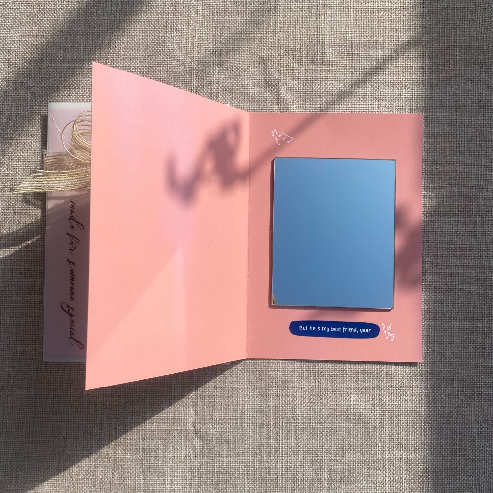 Celebrate your friendship with the "He is My Best Friend Yaar" mirror card With AURORE - GLADIOLUS. This special Gift features a reflective surface, capturing the essence of your bond. Perfect for showing appreciation to your best friend.