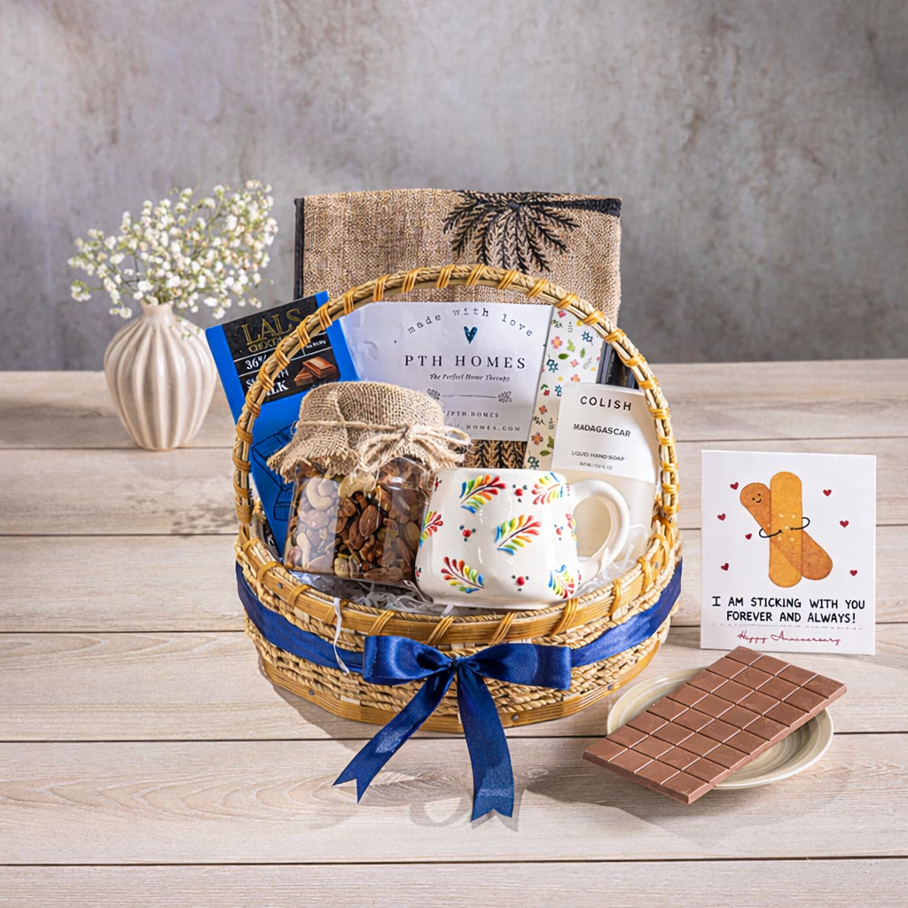 This hamper contains: Hand soap, PTH Homes cushion, Dry fruit jar (250g), Indus cup, Lals blue chocolate box, greeting card, Baskets (Large 12*12) + Packaging