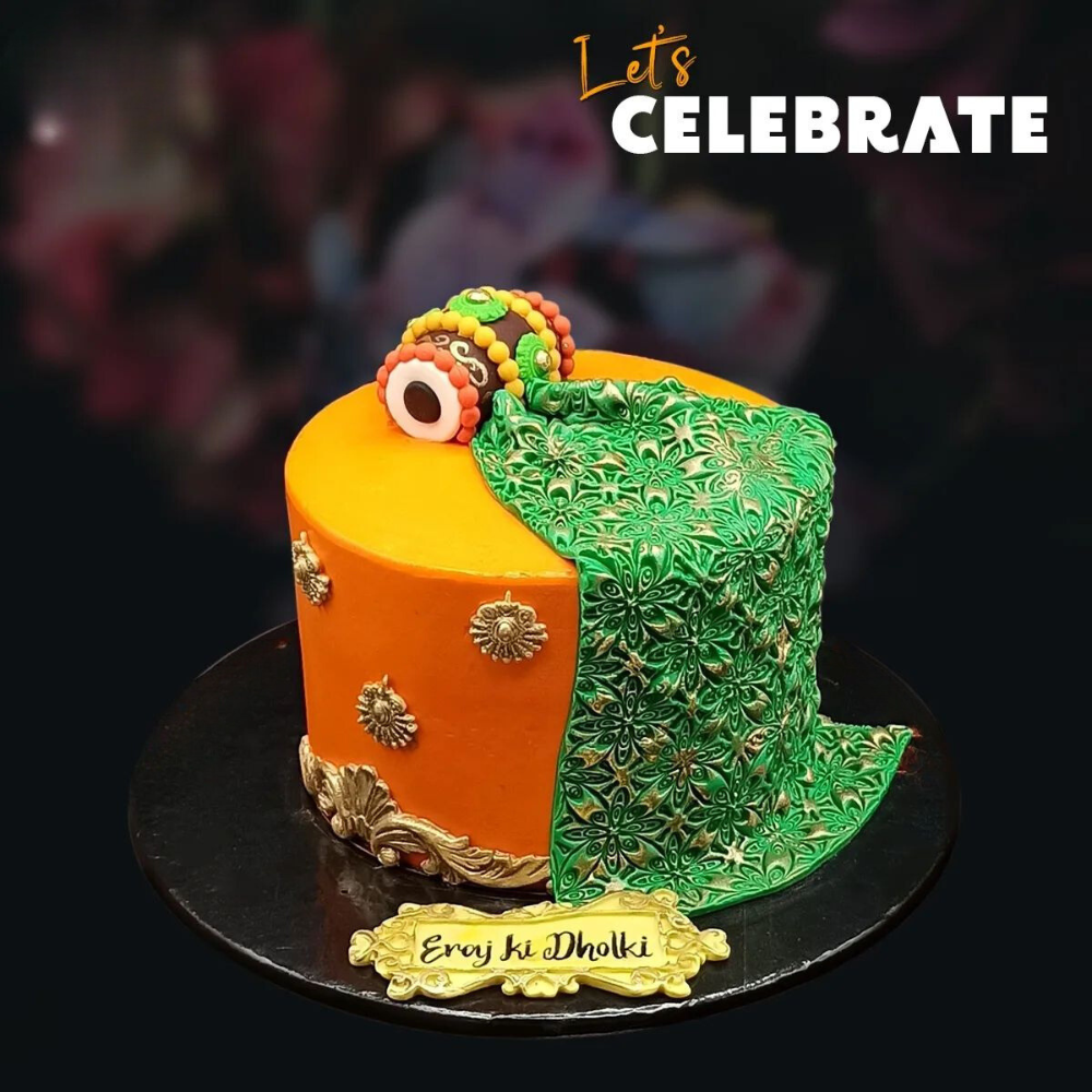 Green Dupatta with Dhol On Top Mehndi Theme cake -Fondant Cake -4lbs