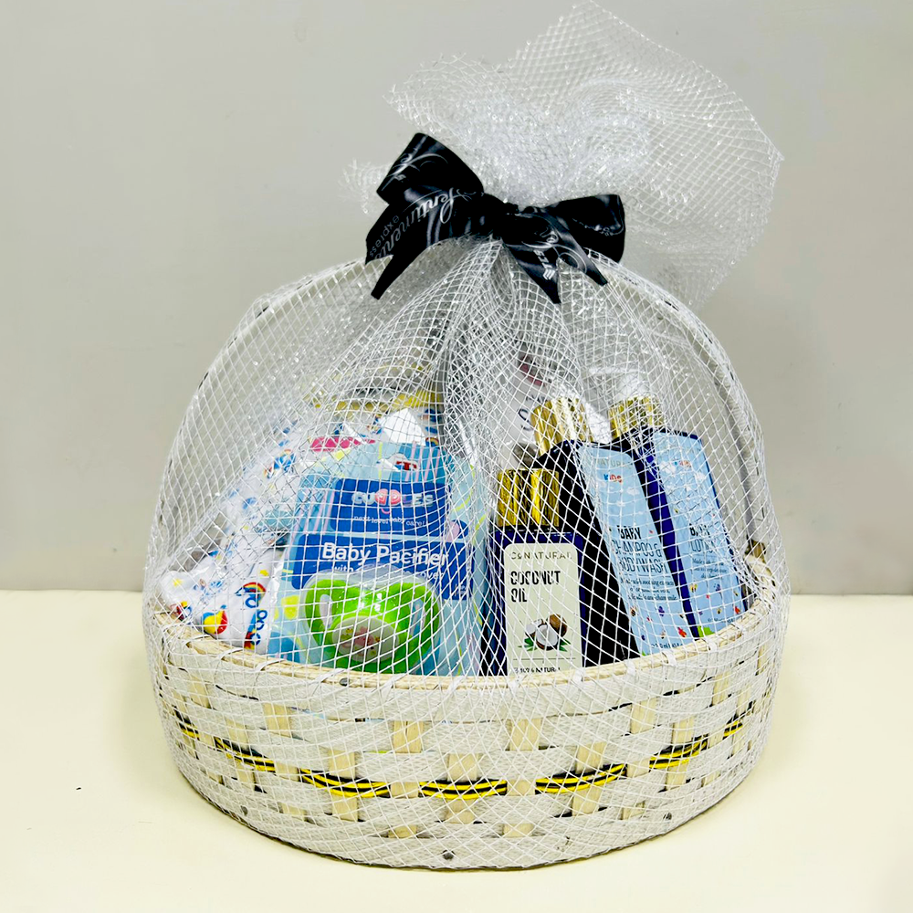 Celebrate the arrival of a little one with a soft blanket, Baby Bundle by Conatural, swaddle pack, Bumzee Pack, baby pacifier, and an elegant basket to complete the look. A thoughtful gift for any new parent.