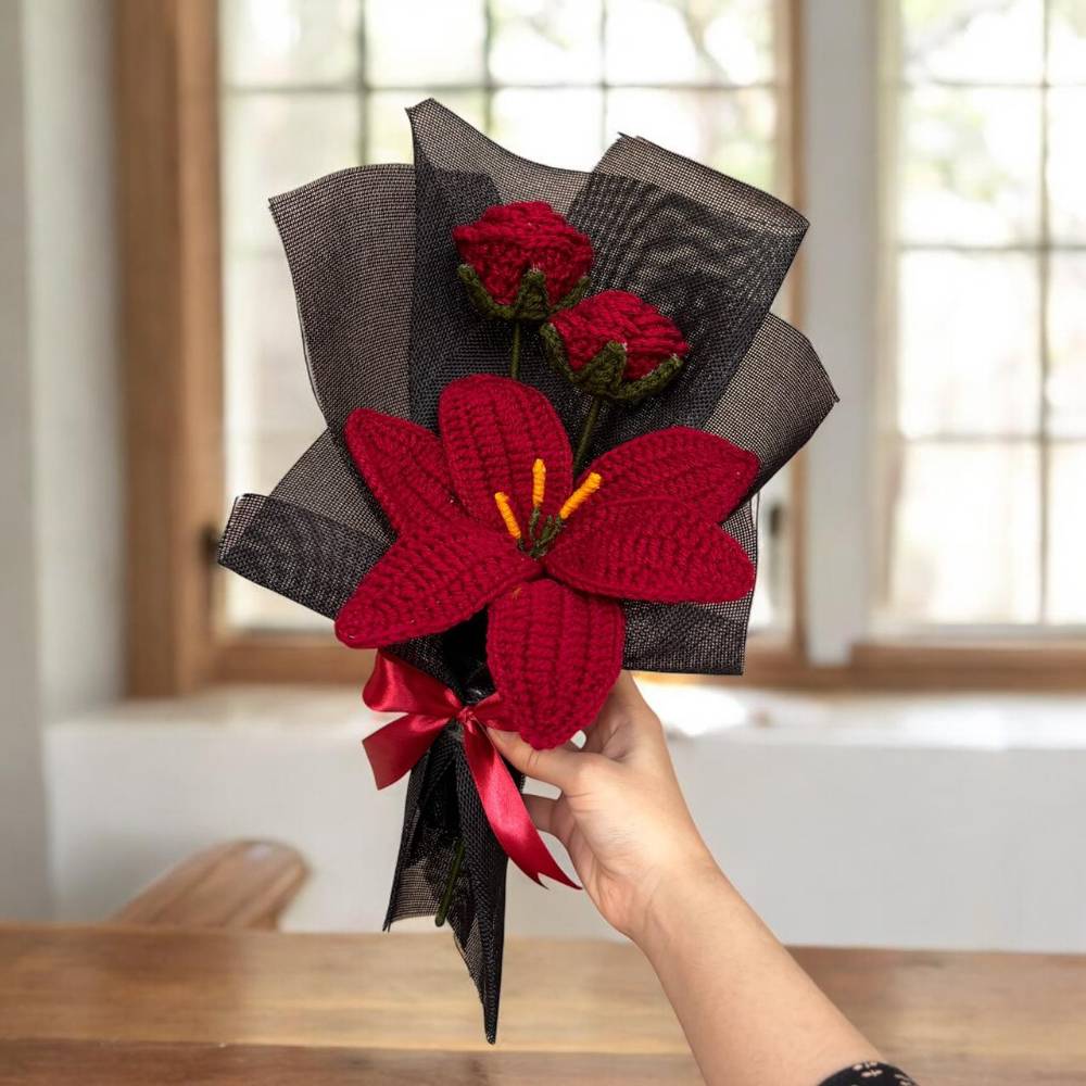 A bold and striking arrangement, this bouquet features one exquisite red crocheted lily accompanied by two red crocheted roses, all wrapped in an elegant black jute covering. The intricate details of each flower make this a unique and thoughtful present for any occasion, representing passion and love.