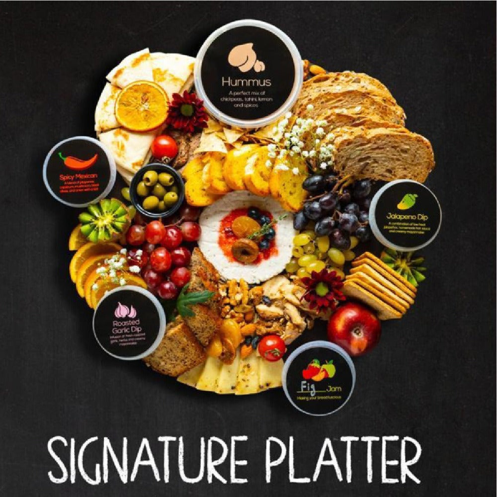 A combination of 25+ flavours - a great mix of artisan cheese cuts, chicken and beef meat cuts, mixed nuts, fresh seasonal fruit, jam and dips, hummus with toasted pita, and assorted breads and crackers.
