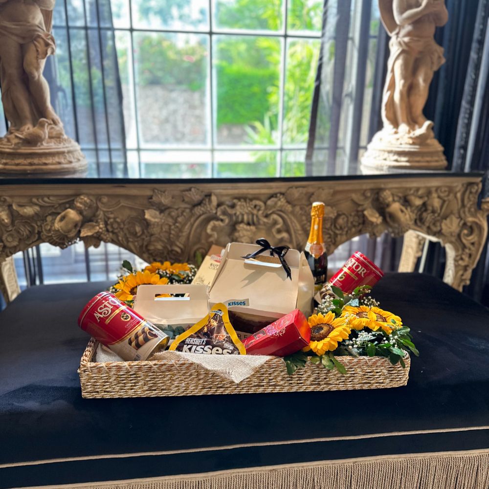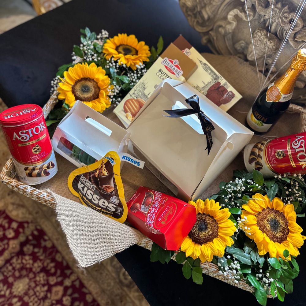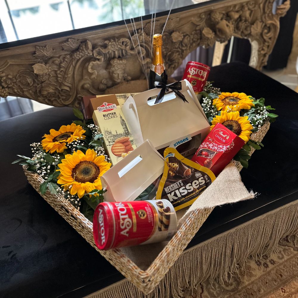 Indulge in the art of gifting with our lavish, extra-large snack basket — thoughtfully curated for any celebration. It features a delightful assortment including a 2 pound cake (can add a personalised message on top), macarons or cookies, two large tins of crispy wafers, two packs of delicious cookies, a 1.5-liter beverage, and two packs of rich imported chocolates. Beautifully accented with fresh florals, this basket exudes luxury and sweetness in every detail.